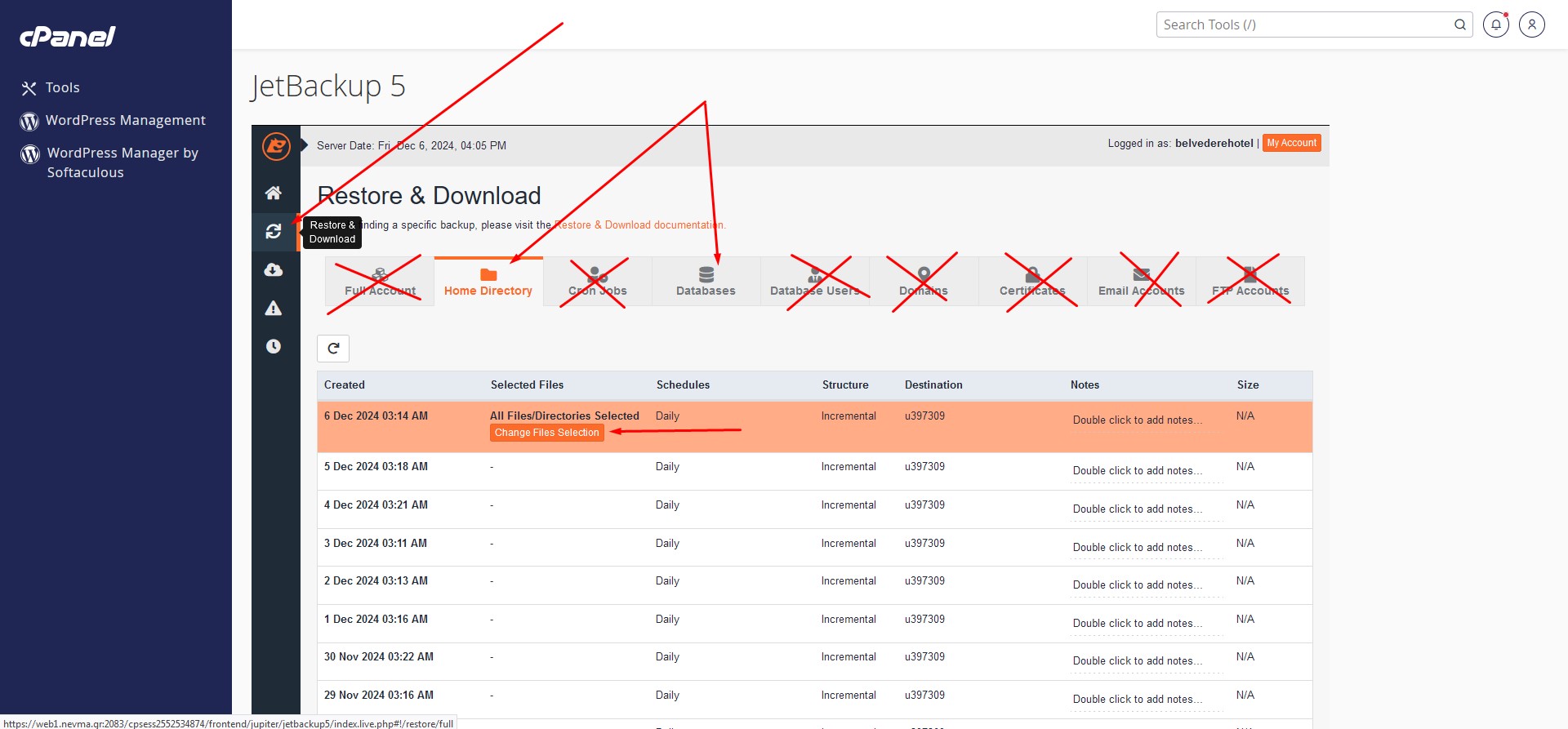 Note: while restoring folders that are direct subfolders of the cPanel account root folder the root folder is locked and the cPanel account is unusable until the restore process finishes. This is due to a cPanel peculiarity.